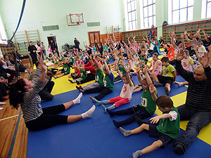 В отличие от остальных этапов, зарядка является мероприятием, где принимать участие можно всей семьёй. Дети и их родители дважды повторили комплекс упражнений: первый раз для разминки, а второй – на зачёт.