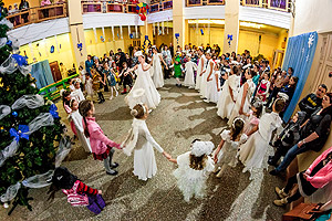 Волшебство для ребят началось еще в фойе. Мальчишки и девчонки в считанные минуты перевоплощались в сказочных персонажей. В дружном хороводе возле ёлки собрались костюмированные гусары и рыцари, принцессы, волшебные феи и снегурочки. В фойе ребята увидели огромную зеленую ель, на которой под восторженные аплодисменты детей зажглась Рождественская звезда. Атмосферу светлого праздника гармонично дополняли хрестоматийные персонажи, хоровая капелла, колокольная звонница и библейский вертеп. Праздник продолжился в зрительном зале.
