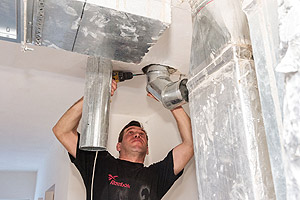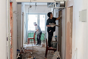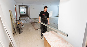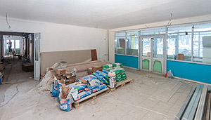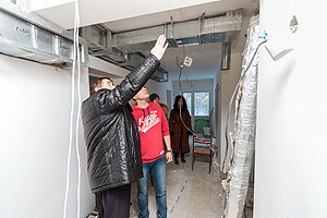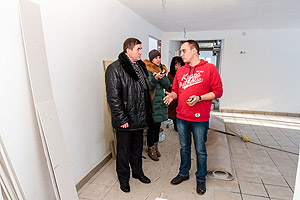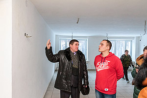 Работа в корпусе кипит, видно, что строители стараются завершить ремонт в срок. Глава осмотрел помещения корпуса, и от его взгляда не укрылись различные недочёты – небольшая протечка на потолке вокруг трубы в туалетной комнате (как пояснили строители, проблему уже устранили), неровно вырезанные отверстия под коммуникации и так далее.