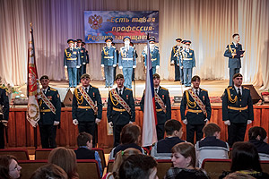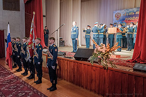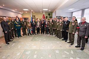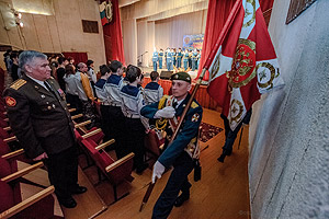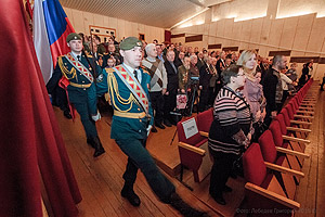В фойе клуба гостей встречал военный оркестр и почетный караул из военнослужащих, одетых в армейскую форму разных периодов, начиная со времен гражданской войны и заканчивая самым современным снаряжением.