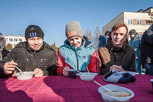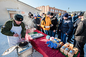 После концерта мероприятия продолжились на плацу войсковой части, где военнослужащие гостеприимно развернули настоящую полевую кухню. Учащиеся школ и гости могли отведать настоящей солдатской каши и согреться горячим чаем.