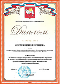 - Иван Аверяскин – 2 место среди студентов, обучающихся по профессии «Станочник (Металлообработка)».