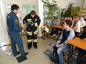 Особый интерес у ребят вызвала одежда современного пожарного,предназначенная для защиты тела от опасных и вредных факторов окружающей среды, возникающих при тушении пожаров и проведении аварийно-спасательных работ. Самому смелому молодому человеку посчастливилось примерить на себя полное обмундирование и продемонстрировать его для учеников своей школы