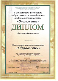 В рамках фестиваля наши участники из Образцовой театральной студии «Одуванчик» Дворца культуры «Октябрь» (режиссер Полина Платонова) показали спектакль «Весь мир – театр!» и по итогам выступления стали обладателями Диплома и кубка в номинации «За лучший спектакль».
