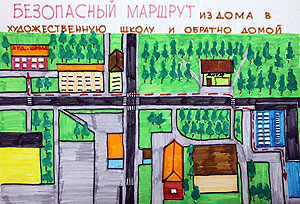 Учащиеся первых классов совместно с родителями проработали безопасные подходы к художественной школе и оформили схемы, на которых отображен безопасный путь ребенка, знаки, переходы, светофоры и архитектурные строения.