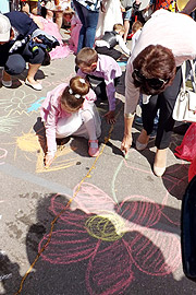 Уже этой осень ребятишки сядут за школьные парты, и у них начнётся новая увлекательная жизнь. А сегодня организаторы праздника сделали всё, чтобы этот солнечный день надолго запомнился дошколятам. Это песни и танцы, салют из 650 воздушных шаров и рисунки на асфальте, вкусное мороженое и герои мультфильмов Кот Матроскин, Мишка, Зайка и Миньон, с которыми можно сфотографироваться.