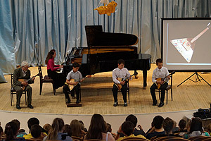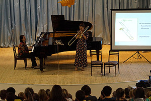 В концерте прозвучали такие инструменты, как рояль, домра, скрипка, виолончель, ансамбль балалаек. Настоящим сюрпризом стало выступление исполнительниц на гобое и тромбоне.
