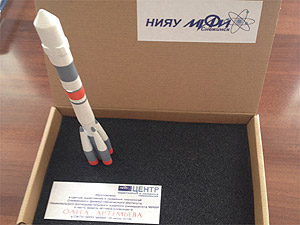 Еще оперативнее удалось реализовать идею руководителя СФТИ НИЯУ МИФИ Оксаны Линник о создании памятного сувенира для гостя вуза Героя России летчика-космонавта Олега Артемьева. Макет ракеты «Союз-2», на которой космонавт совершил свой первый полет, был изготовлен из полимера с помощью промышленного 3D принтера SolidCAD S650 по фото из Интернета к утру следующего дня после получения задания. На долгие «раскачки» времени просто не было: в этот же день специалисту Центра Александру Пильщикову предстояло отбыть в Подмосковье для участия в финале Национального чемпионата «Молодые профессионалы» World Skills Russia-2016 по компетенции «Прототипирование».