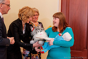 Руководители города тепло поздравили семьи с пополнением. Из десяти новорождённых пятеро являются первенцами, четверо – вторыми детьми, один – третьим ребёнком в своей семье. Родители назвали их так: Кира, Всеволод, Мира, Роман, Анастасия, Дмитрий, Алина, Николай, Екатерина, Дмитрий.