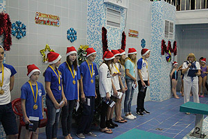 В 10 часов в бассейне состоялась «Новогодняя ёлка на воде для групп начальной подготовки первого года обучения», на которой присутствовали около 60 младших пловцов и наставник тренер-преподаватель И.Ю. Витьман.
