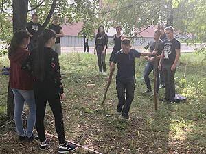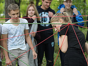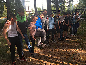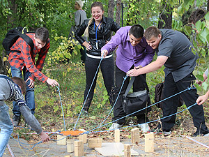 Мероприятие по развитию командообразования для первокурсников проводится в СФТИ НИЯУ МИФИ уже третий год подряд. Препятствия, привычные для спелеологов, скалолазов и туристов, расположились в парковой зоне вуза с помощью председателя федерации по спелеотуризму Снежинска А.В. Кузнецова. Справиться с «запутанной» ситуацией (точнее, расположенными в особом порядке веревками, пеньками, канатами и пр.) можно было лишь при условии слаженной командной работы и безоговорочного доверия.