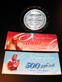 Победителем, пятый год подряд, стал магазин «Меркурий» (генеральный директор Бабак Валерий Васильевич, директор Шитова Любовь Васильевна). По всем конкурсным критериям магазин набрал максимальное количество баллов. Оформление витражей, торгового зала и прилегающей территории, как всегда, отличалось оригинальностью и использованием разнообразных светодинамических эффектов. Коллектив магазина «Меркурий» награждён дипломом и подарочным сертификатом на сумму 3, 5 тысяч рублей на покупку товара в магазине «Комфорт».