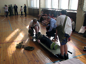 На заключительном этапе эстафеты два представителя команды оказывают помощь пострадавшему.