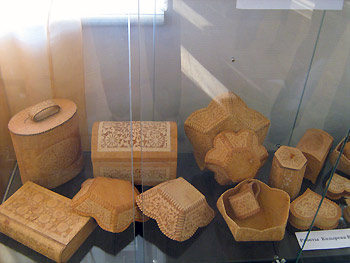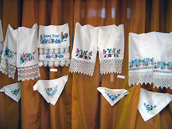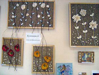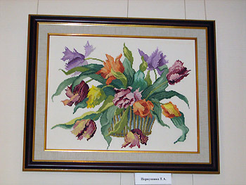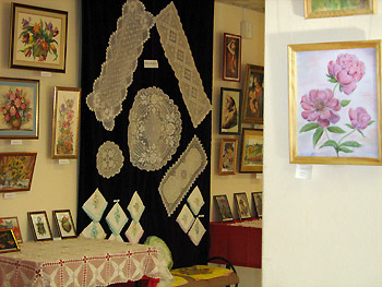 В экспозиции представлены такие работы, как вышивки, кружевоплетения, роспись по ткани, различные виды вязания, резьба по дереву, обработка бересты и др.