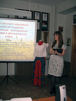 1 место – Невенченкова Анастасия и Скляренко Екатерина (Дворец творчества), тема – «Влияние русского народного костюма на создание современной молодежной коллекции в фольклорном стиле»;