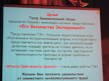 После фильма группа снежинских школьников отправилась в Театр Занимательной Науки. Это большое интерактивное представление, увлекательный спектакль и яркое научное шоу. «Играть! Действовать! Думать!» – таков девиз работы Театра Занимательной Науки. Набор красивых экспериментов по различным темам, продуманная и неординарная форма показа с участием зрителей, проблемные ситуации, микроисследования, вопросы, над которыми захочется поразмышлять – всё это испытали на себе наши ребята.