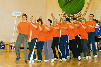 Поэтому в течение всего вечера команды в восьми разноплановых конкурсах-эстафетах боролись друг с другом и с непослушным футбольным мячом. Его катали, пинали, набивали, забивали, держали на голове и даже носили на спине.