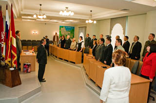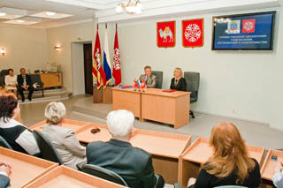 Представитель руководства Щелкина Наталья Перевалова зачитала собравшимся депутатам, сотрудникам администрации Снежинска и ядерного центра обращение городского головы Владимира Шкалаберды и вручила подарок - флаг города, на котором мирно уживаются дельфины и символическое изображение атома (Щелкино начинался как городок строителей Крымской АЭС).