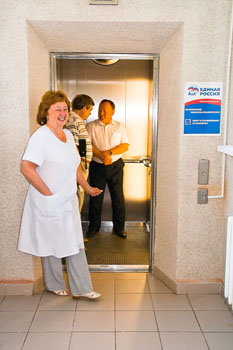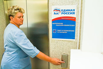 …Первые пассажиры недоверчиво переспрашивали, и вправду ли можно подняться наверх, и только после подтверждения нажимали на кнопку, около которой висит стикер «Единой России» с отметкой о выполнении наказа избирателей: «Лифт в поликлинике установлен».