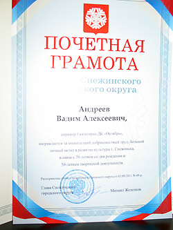 Сегодня, в торжественной обстановке почетной грамотой главы Снежинского городского округа за многолетний добросовестный труд, большой личный вклад в развитие культуры Снежинска, в связи с 70-летием со дня рождения и 50-летием творческой деятельности был награжден дирижер ДК «Октябрь» Вадим Алексеевич Андреев.