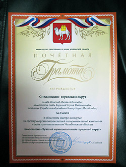 Министерство образования и науки наградило почетной грамотой Снежинский городской округ за 3 место в областном смотре-конкурсе на лучшую организацию летней оздоровительной кампании среди муниципалитетов Челябинской области в номинации «Лучший муниципальный городской округ».