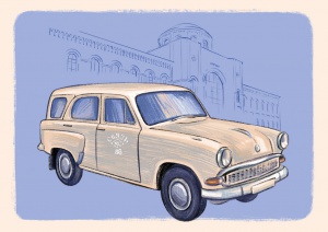Открытку украшает почтовый ретроавтомобиль — Москвич-423Н. Дизайнер срисовала его с фотографии, хранящейся в Музее почтовой связи Челябинской области. Москвич-423Н был одним из транспортных средствАвтобазы связи. На нём в 1970-е годы в Челябинске развозила письма, посылки и газеты по почтовым отделениям первая женщина-водитель Автобазы связи Валентина Яковлевна Андреева.