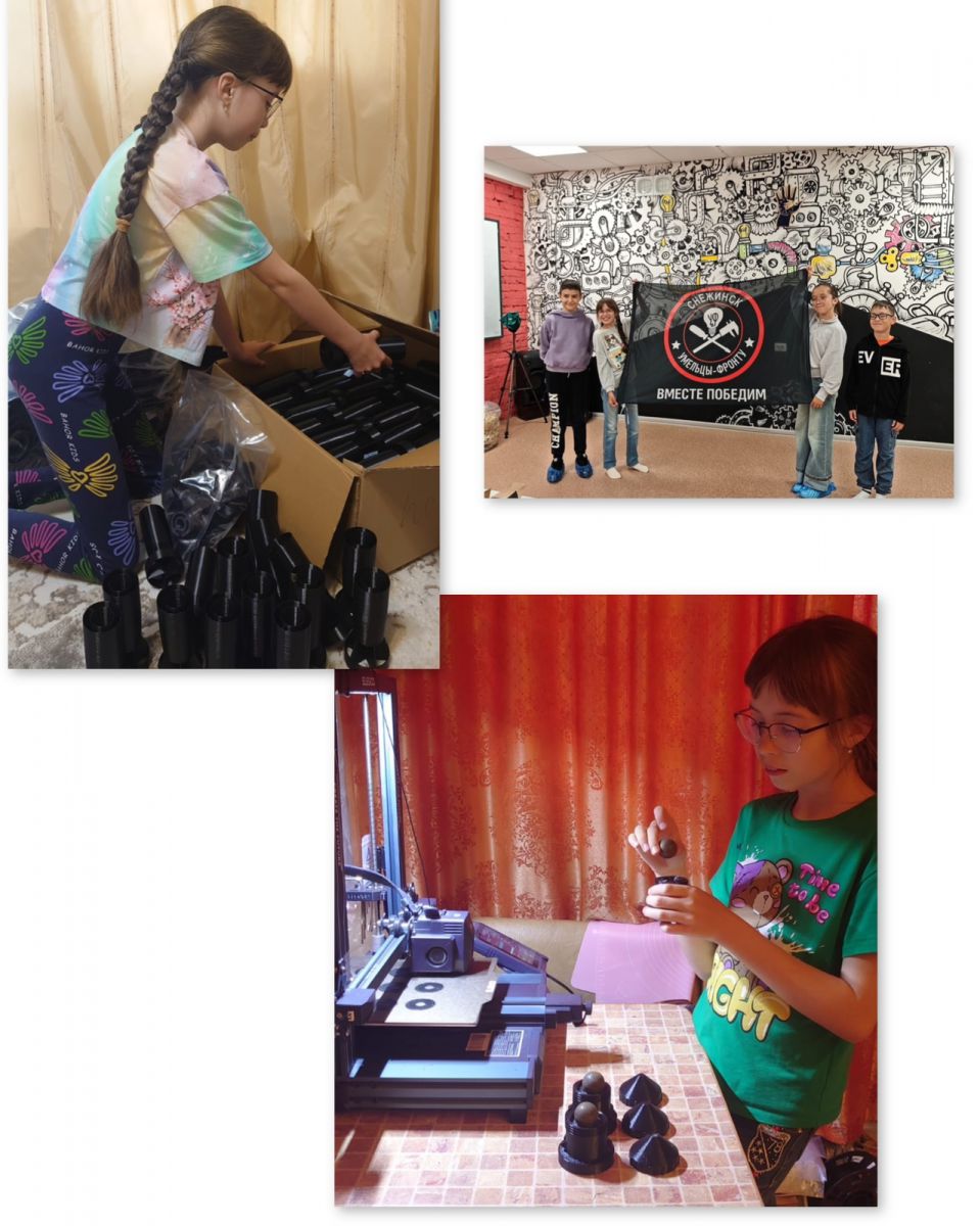 На принтере она печатает такие нужные нашим защитникам изделия, как ФАБы, «накольники», «зверобои», «ампульницы», «инерционники». Эти и другие изделия её научил делать идейный руководитель народного сообщества УМЕЛЬЦЫ ФРОНТУ СНЕЖИНСК Алексей Ерохин.