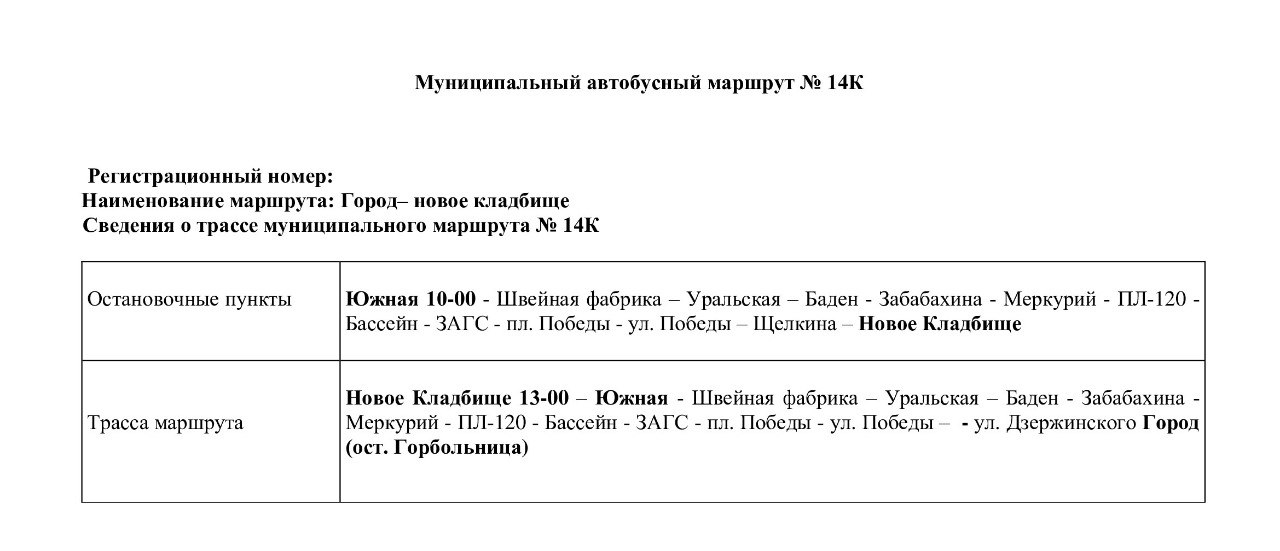 Уважаемые жители, на прошлой неделе мы анонсировали запуск бесплатного нового маршрута № 14К на Новое кладбище. Компания-перевозчик ООО «Автоэкспресс» приняла решение для удобства горожан сделать его еженедельным - каждую субботу.