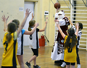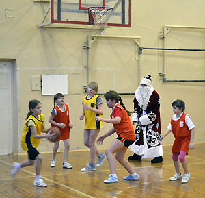 Новогодний турнир по баскетболу также не остался без внимания Деда Мороза. Он принял самое активное участие в судействе баскетбольных матчей. В самый разгар соревнований «дедушка» не удержался от соблазна и вышел на площадку, чтобы принять участие в игре.