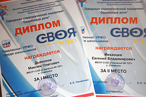 В итоге Максим стал Чемпионом Уральского федерального округа, а Женя – серебряным призёром "Своей игры". Победа дает право городу Снежинску выставить в будущем году на эти соревнования четверых игроков! Снежинцы ещё раз подтвердили, что сегодня они – сильнейшие интеллектуалы на Урале среди школьников.