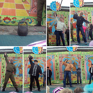 В конкурсе «Тяга» соревновались в распиливании бревна, а в конкурсе «Гиря» нашёлся самый сильный мужчина: его жим правой рукой 32-килограммовой гири составил 54 раза!
