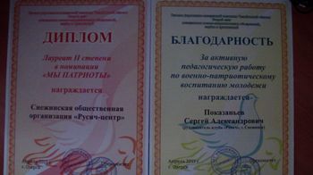 Президенту СГОО «Русич-центр» С. А. Показаньеву выражена благодарность за активную педагогическую работу по военно-патриотическому воспитанию молодежи.