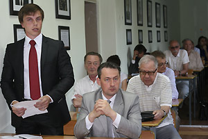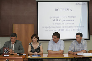 По окончании совещания ректор НИЯУ МИФИ М.Н. Стриханов провел встречу с ученым советом и профессорско-преподавательским составом СФТИ НИЯУ МИФИ, на которой также присутствовали: и. о. руководителя СФТИ НИЯУ МИФИ О.В. Линник, председатель Ученого совета СФТИ НИЯУ МИФИ, заместитель директора РФЯЦ-ВНИИТФ Б. К. Водолага и проректор НИЯУ МИФИ Н.М. Дмитриев.