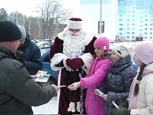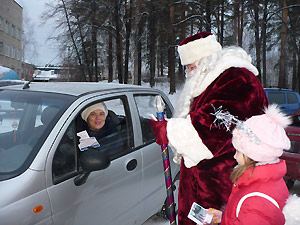 Во-первых, сюрпризом стал сам Дед Мороз, потому что в звании майор такового в течение года на дороге не встретишь. Во-вторых, ГАИшный Мороз останавливал авто не жезлом, а посохом. От имени госавтоинспекции он поздравлял водителей и вместе с ЮИДовцами вручал календари-2014 с логотипом: «Внимание! Дети!».