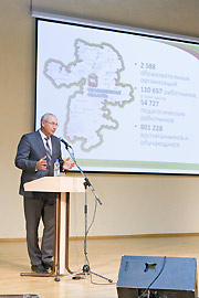 С приветственным словом выступил глава города Снежинска А. Н. Тимошенков. Он отметил, что образованию в Снежинске всегда уделялось и уделяется очень большое внимание. Достигнуто почти 100-процентное обеспечение детей с двух лет местами в детских садах, созданы группы для малышей ещё более раннего возраста. В прошлом году был открыт новый детский сад на 205 мест, продолжается реконструкция детского сада в посёлке, и с помощью области в скором будущем в его стенах зазвенят детские голоса. Уже много лет Снежинск удерживает свои позиции на верхних строчках областного рейтинга по результатам ежегодной итоговой аттестации школьников.