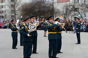 После митинга состоялось возложение цветов к памятнику Солдату-освободителю. Празднование продолжилось парадом военнослужащих войсковой части №3468 и выступлением военного оркестра.