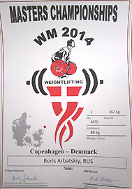 В Копенгагене (Дания) с 30 августа по 6 сентября проходил чемпионат мира по тяжелой атлетике среди ветеранов. Первое место в возрастной категории М-70, весовой категории 85 кг занял Арбатский Борис Пантелеймонович – тренер-преподаватель МБОУ ДОД «ДЮСШ «Олимпия». Поздравляем победителя!