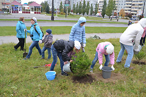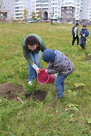 Участники театральной студии «Одуванчик» и общественной организации «В кругу друзей» высадили саженцы на аллее возле дома по ул. Забабахина, 42.