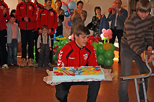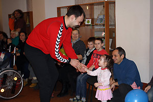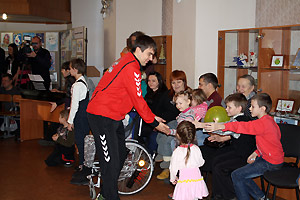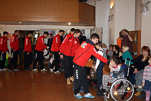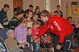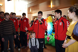 Ярким эмоциональным моментом праздника стало появление в зале дружины красавцев-спортсменов в яркой спортивной форме. Игроки снежинской команды «Сунгуль» тепло поприветствовали каждого ребёнка-инвалида, подарив добрую улыбку и рукопожатие. «Чужих детей не бывает!» - сказал в своём выступлении один из членов команды. Наши гандболисты – друзья «Бумеранга добра», они уже оказали организации большую помощь в ремонте помещения и в будущем тоже собираются вносить свою лепту в общее дело.