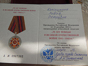 6 марта главой Снежинского городского округа А. Н. Тимошенковым и его заместителем О. П. Карповым юбилейными медалями «70 лет победы в Великой Отечественной войне 1941-1945 гг» торжественно награждены: Рашкован Вера Петровна, Кукушкина Лидия Петровна, Портнова Анна Григорьевна, Мохначева Мария Георгиевна, Жучихина Анна Васильевна, Фатеева Антонина Тимофеевна, Чернова Анна Сергеевна, Пилявская Анастасия Тодотовна, Мурзина Зинаида Васильевна.