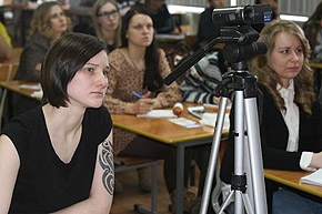 На протяжении двух часов Юлия Гилева и Полина Ступина делились с присутствующими секретами профессионального мастерства. И ребята, и взрослые (всего в мероприятии приняли участие более 40 человек) даже стали участниками спецподготовки для репортеров, в ходе которой старшие товарищи стали «спикерами», а младшие – журналистами.