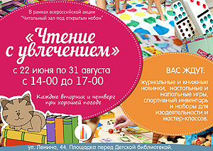 Детская библиотека города Снежинска приглашает всех желающих на свою площадку в рамках всероссийской акции «Читальный зал под открытым небом». С 22 июня по 31 августа, с 14.00 до 17.00, каждые вторник и четверг (при хорошей погоде), маленьких читателей, а также их родителей ожидает «Чтение с увлечением».