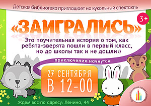 27 сентября, в 12.00, Детская библиотека и кукольный театр «Теремок» приглашают всех-всех-всех на кукольный спектакль «Заигрались». Это поучительная история о том, как ребята-зверята пошли в первый класс, но до школы так и не дошли. А что с ними произошло, вы узнаете, когда придете на спектакль.