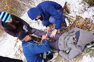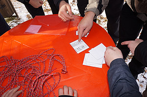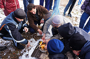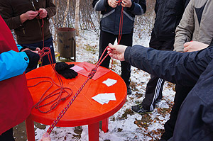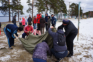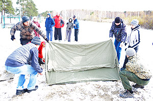 Участникам было предложено преодолеть следующие препятствия: установка двускатной палатки, розжиг костра (здесь участники должны были пережечь нитку, натянутую на определенной высоте), далее шла «переправа по кочкам», вязка узлов, ориентирование по условным знакам (участники тянули карточки с изображением различных условных знаков), затем участники должны были оказать первую медицинскую помощь и перенести пострадавшего до пункта. Заключительной точкой был этап сбора палатки – здесь секундомер останавливался, и засчитывалось общее время прохождения дистанции участниками команд.