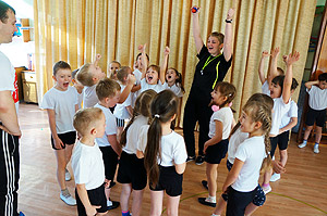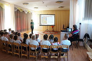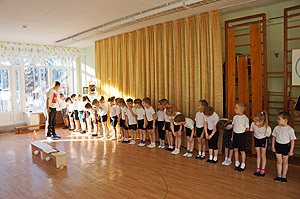 Перед началом занятия инструктор по физическому воспитанию показала детям презентацию и рассказала, что же такое комплекс ГТО. И вот уже после теории дети перешли к практическому занятию.