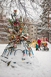 Во многих дворах Снежинска, начиная с декабря, закипела работа по строительству ледяных горок. Жители, от мала до велика, сгребали снег, сооружали горки, заливали их водой. Позаботились и о том, чтобы украсить свои творения и сам двор новогодней мишурой, маленькими ёлочками, самодельными ёлочными игрушками.