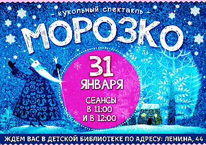 Детская библиотека и кукольный театр «Теремок» приглашают всех девчонок и мальчишек, а также их родителей, бабушек и дедушек на кукольный спектакль «Морозко».