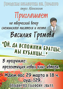 29 марта, в 18:00, отдел «Абонемент» городской библиотеки приглашает на творческую встречу со снежинским писателем и поэтом Василием Громовым.