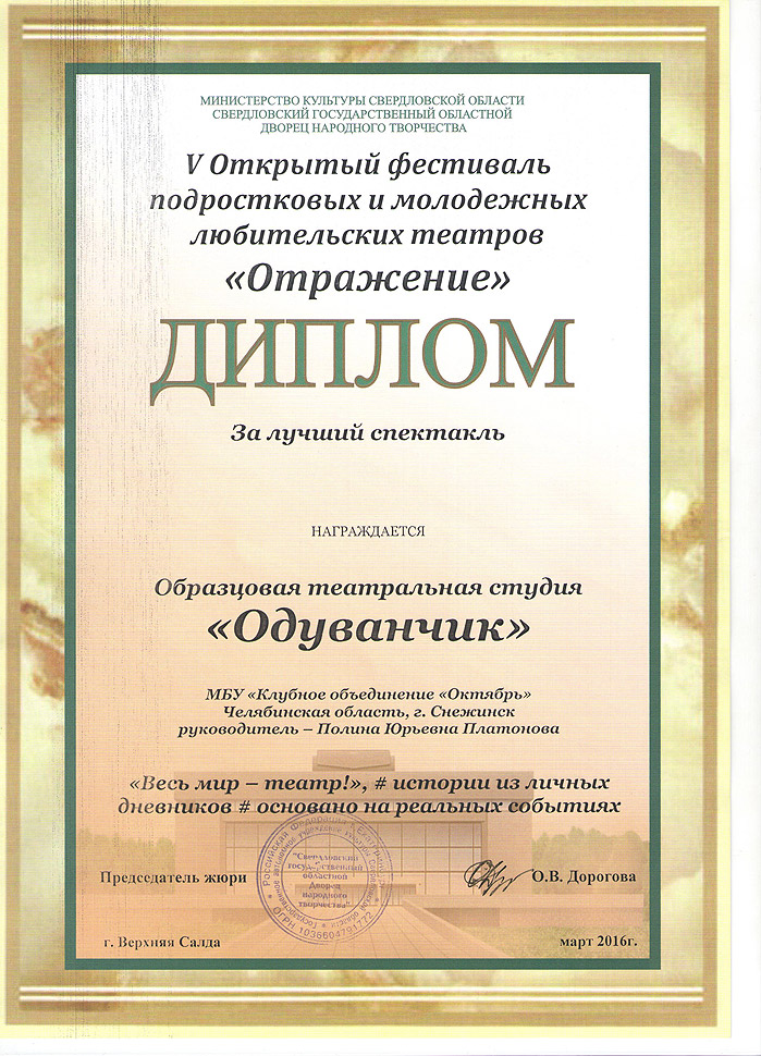 С 27 по 29 марта 2016 во Дворце культуры им. Г.Д. Агаркова города Верхняя Салда Свердловской области прошел V Открытый фестиваль подростковых и молодежных любительских театров «Отражение». Учредитель и организатор фестиваля – Министерство культуры Свердловской области и областной Дворец народного творчества.