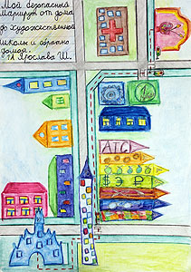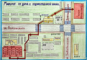 Учащиеся первых классов совместно с родителями проработали безопасные подходы к художественной школе и оформили схемы, на которых отображен безопасный путь ребенка, знаки, переходы, светофоры и архитектурные строения.